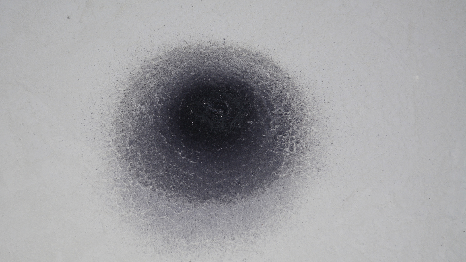 Instalación en Espacio Cultural La Leñera, en el contexto de la exposición conmemorativa de los 50 años del golpe militar “Inscripciones”. Disco de madera, cal, balde, agua y tinta china. Dimensiones variables.